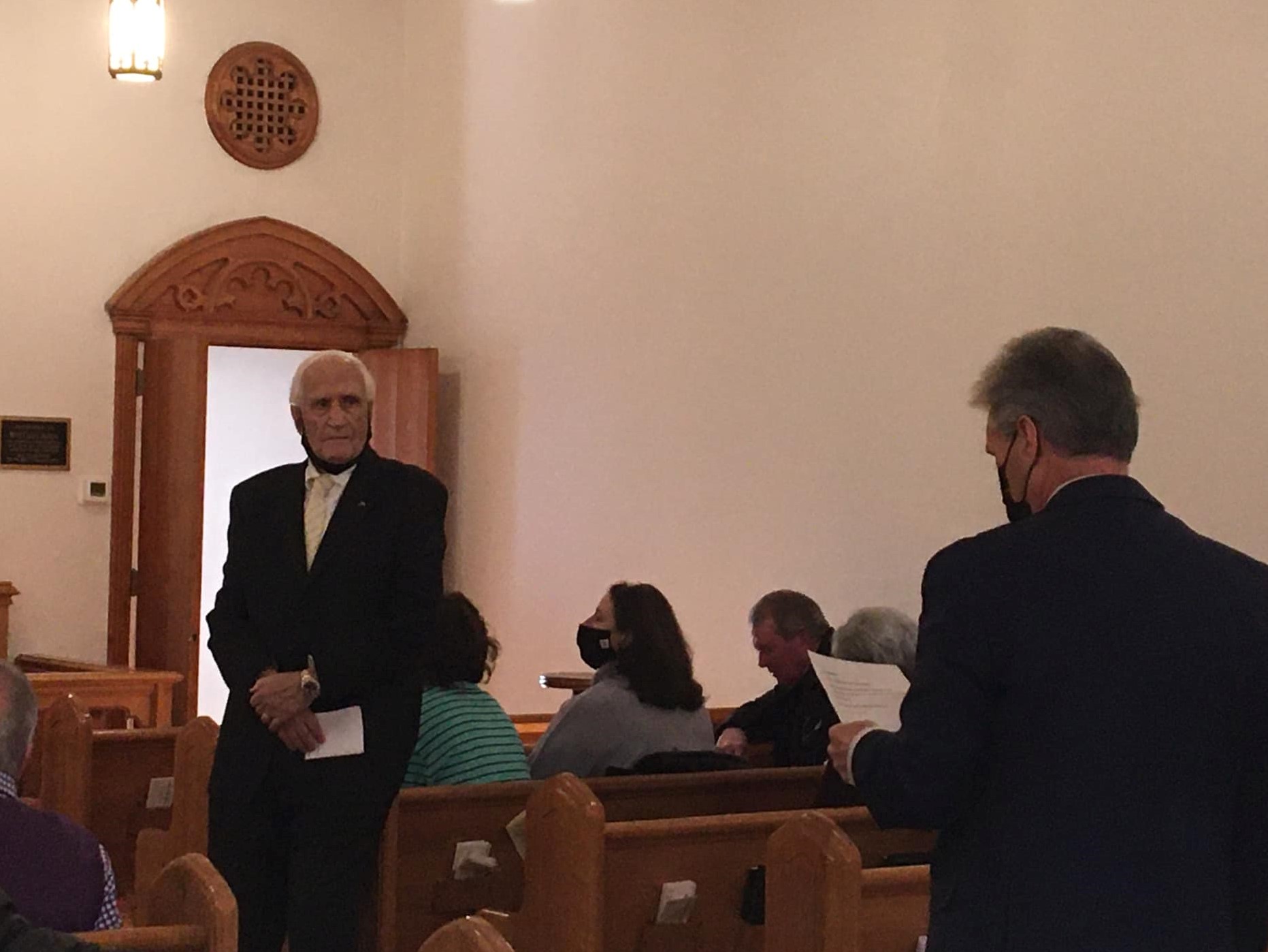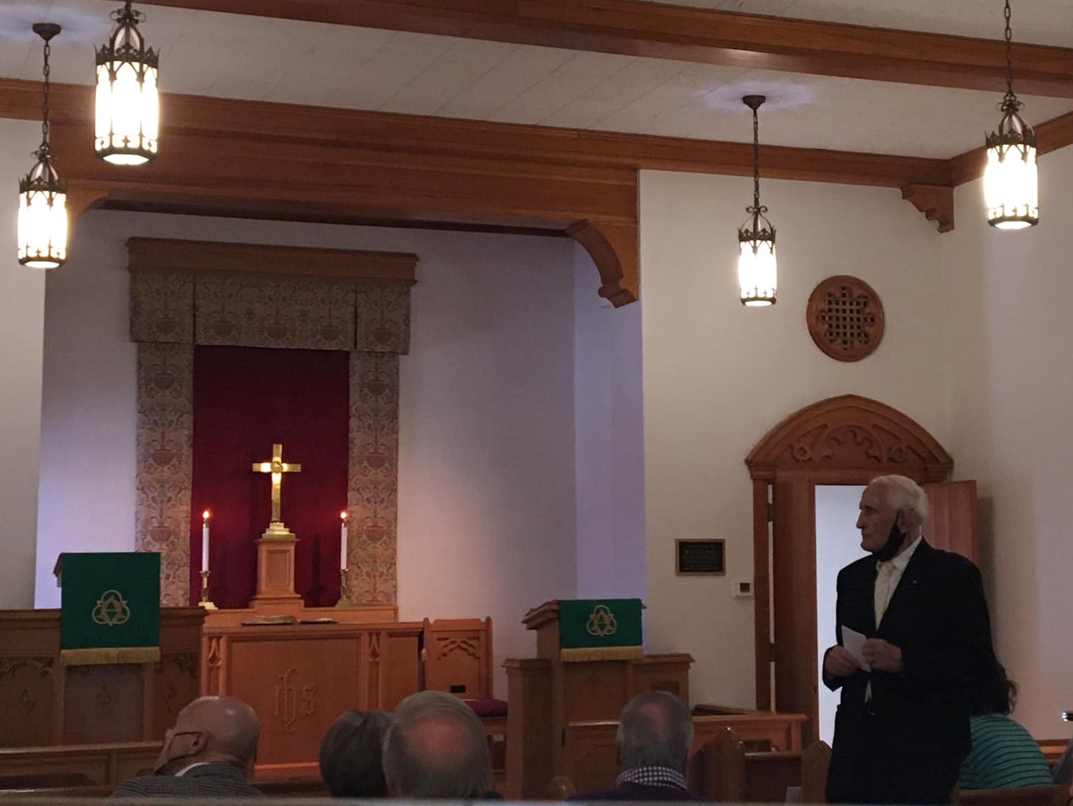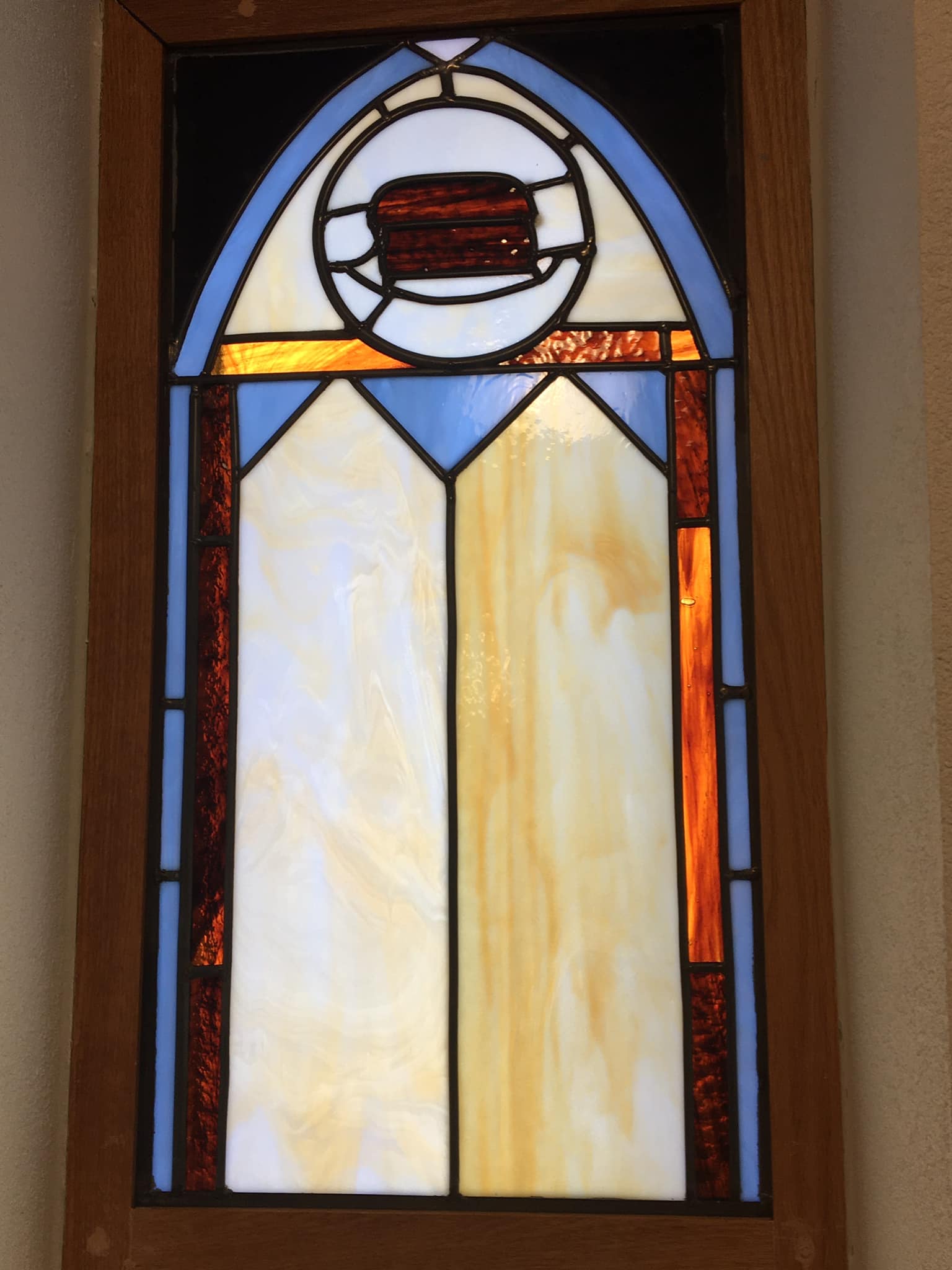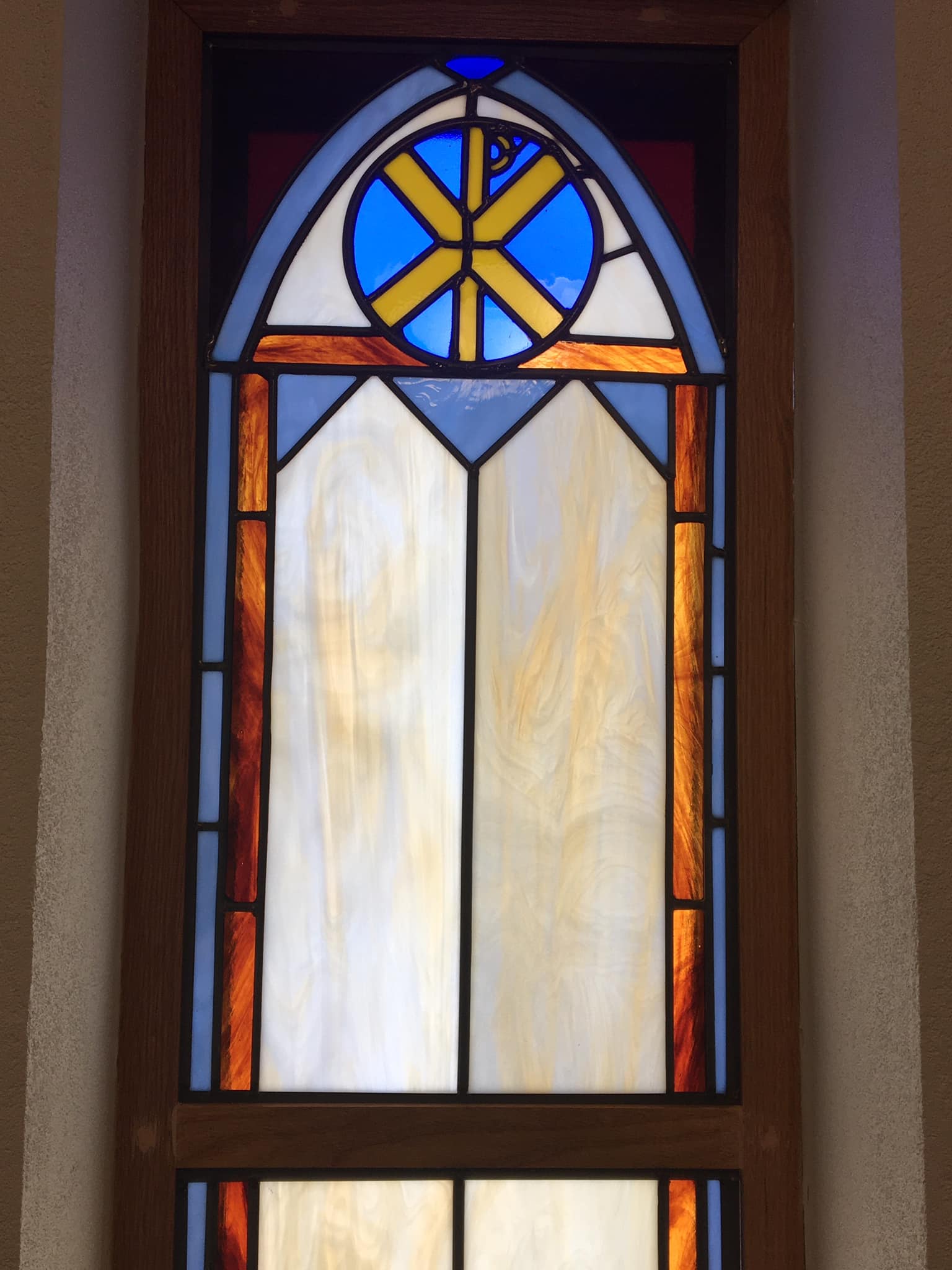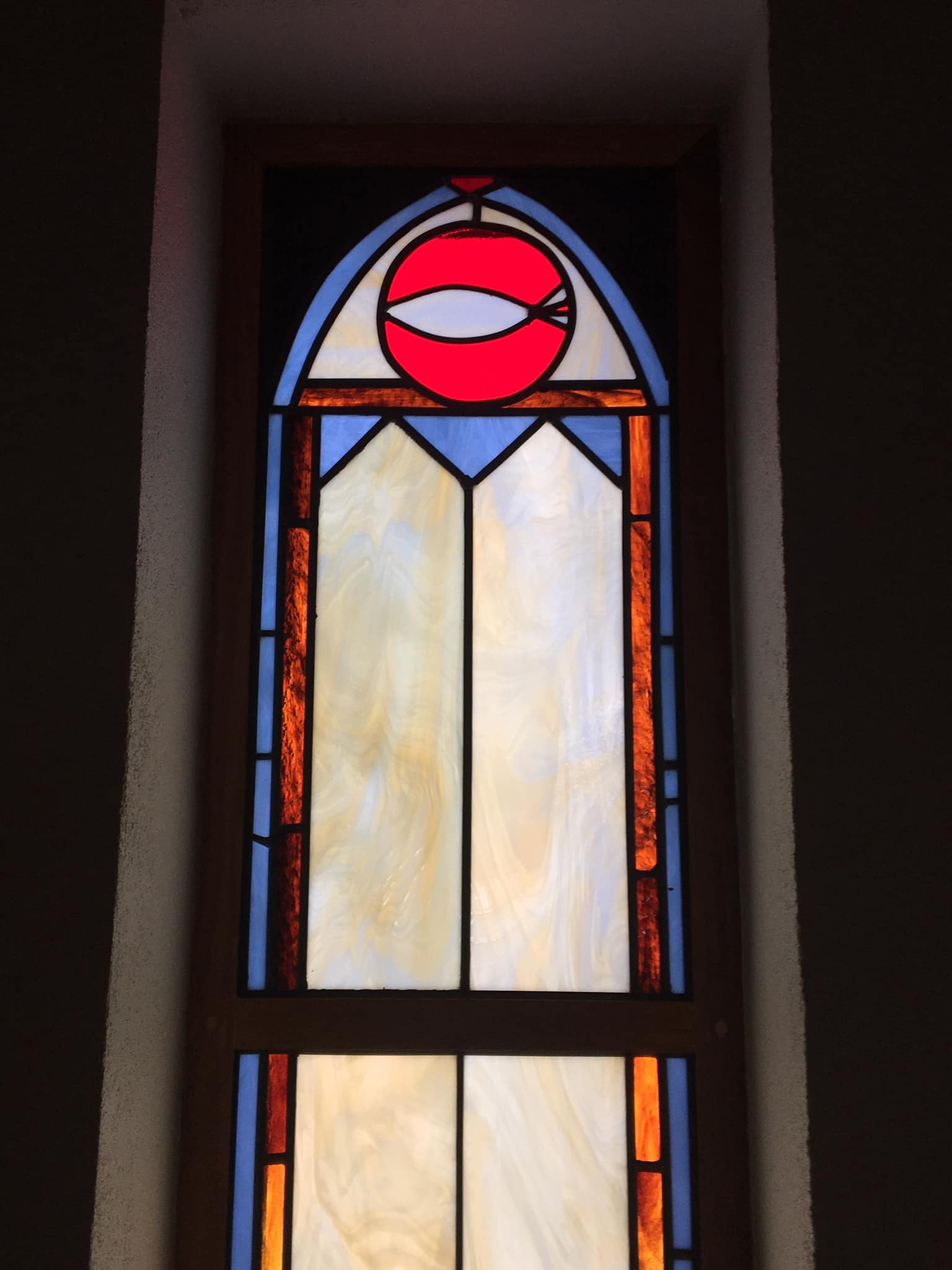 These three new stained-glass windows at the back of the Long Memorial Chapel were – like the other windows in the Chapel – made by member Dr. Stephen Saunders.